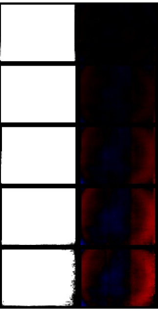 The right column shows the learned depth multiplier image. Here, blue means that raw data must move further away to produce accurate measurements, and red means that raw data must move closer.